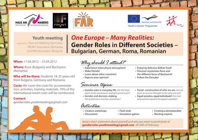 Schimbul de experienta va avea loc in perioada 17 -25 aprilie 2012 in Bucuresti si Ruse (Bulgaria) si va fi alcatuit din mai multe sesiuni avand ca tema rolurile de gen (feminin/masculin) si diversitatea culturala. Participantii vor discuta si vor afla mai multe despre apartenenta etnica si ce inseamna sa fii femeie/barbat in diferite contexte sociale europene.